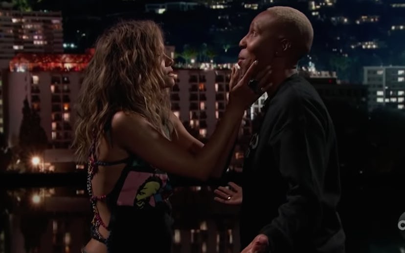 When Lena Waithe took over as a guest host on Jimmy Kimmel Live, her first time ever as a late-night host, actress and friend Halle Berry knew exactly how to pump her up. After Kimmel's security guard Guillermo Rodriguez hit the "Berry Button" (a large button on the wall that says just that), Berry came running out in a backless tee and boyfriend jeans to give Waithe a pep talk... and plant one on her.