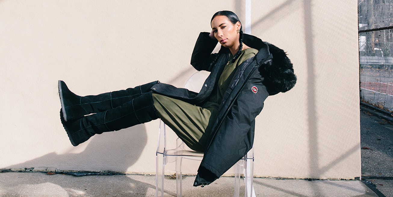 Multi-hyphenate Saber is a creative consultant, writer, and style star. She's tight-lipped about her current project, but hints that she's designing something "all about blending my two worlds, my South Asian blood with my New York ties and creating something that emulates how I was raised and brought up." Is it any wonder we look to her to see what's trending? "I like to balance masculine, androgynous pieces with feminine silhouettes," Saber says. "I like comfort and versatility. Good design is important." You can see her preference for well-designed comfort in the way she wears the oversized Catherina Puffer and Tahoe Snow Boots with a mock neck top and looser pants.