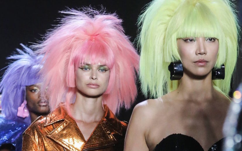 Jeremy Scott kicked off New York Fashion Week with an ultra-bright runway show, filled with high hair and all the best elements of '80s fashion. During Scott's SS20 offering, all the models rocked sky-high, shoulder-length bobs with bangs in various Easter egg hues that have me taking notes for the next time I hit the salon. The collection was filled with big sequins, big shoulders, big ruffles, and big everything.