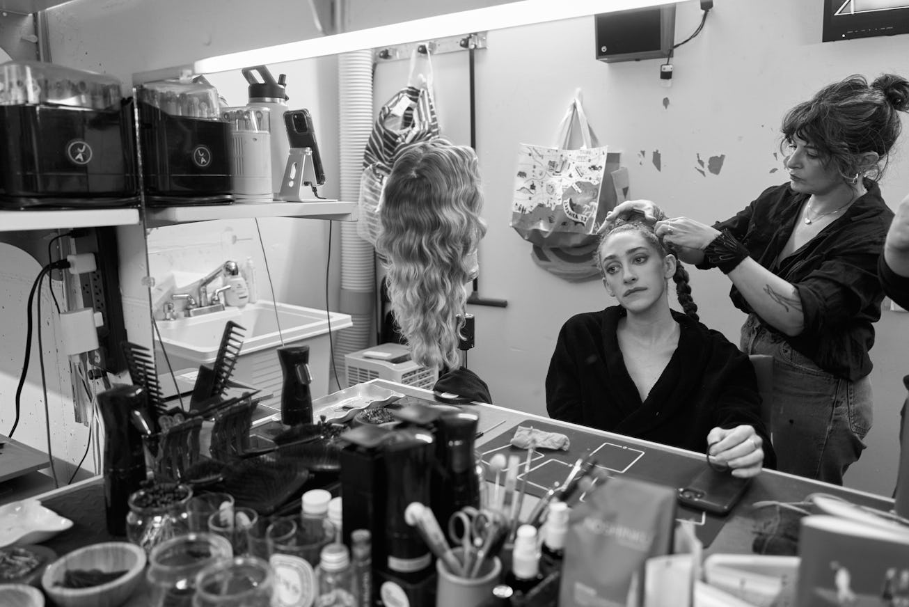 I get to the theater an hour before curtain. I do my makeup, which is Brooklyn grunge: a little smudgy, a little rebellious. I’ll listen to something like Fleetwood Mac or Barbara Streisand’s memoir (equally thrilling) while I put on blush with my fingers. And then I warm up in a small, dark closet because I share a dressing room and don’t want my colleagues to hear me blow through a straw and stretch my tongue. These are intimate tasks one should do on their own. Then I throw on my strawberry mullet and my fuzzy green sweater and we hit the deck.