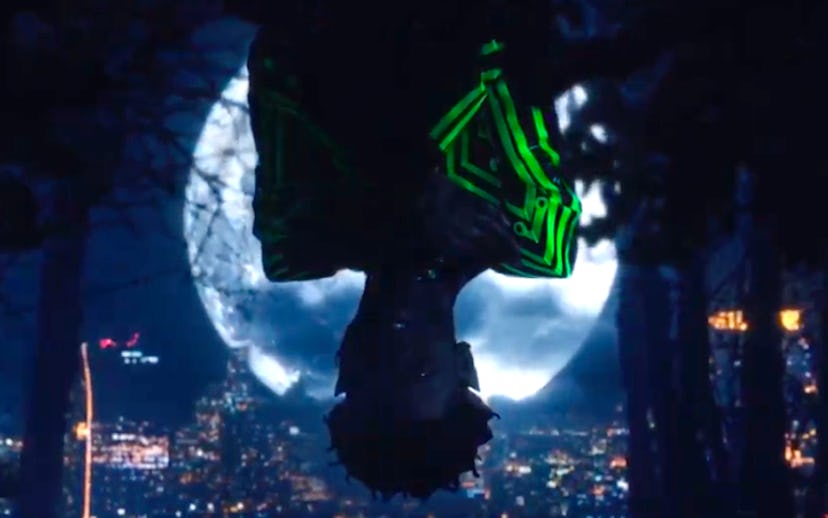 Save this video for your Halloween 2020 mood board, if not for each detail, but for Lil Nas X's diamond fang grills and black PVC spiked jumpsuit. Nas' entry into the video — or, as he refers to himself in the song, "Big Nas" — marks the beginning of The Matrix interpolation. He's fitted in a leather trench and tiny sunnies, and Nas in a slime-green upgrade of his Grammys Matrix-inspired trench.
