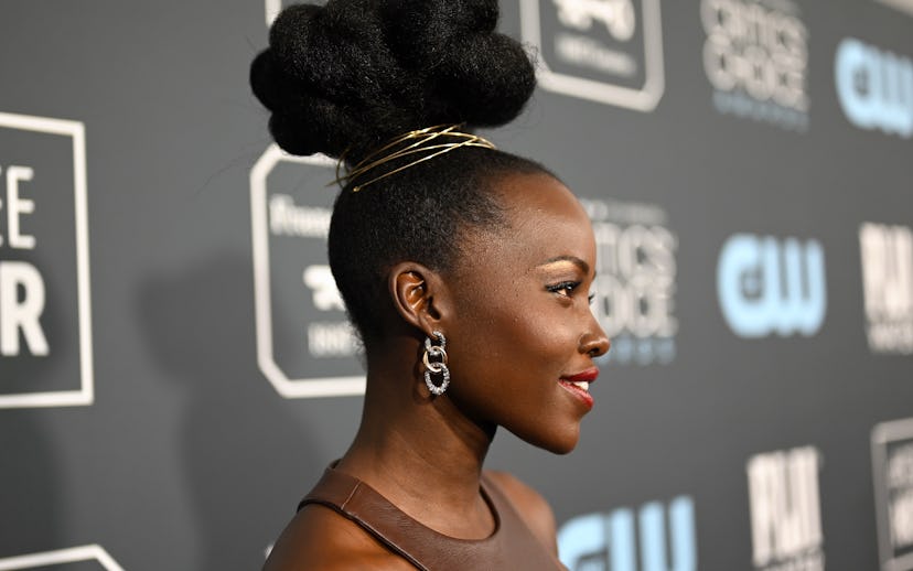 Award season is in full swing, and celebrities are officially turning up the volume on the red carpet, from their gowns to their glam. Need proof? Just take a look at Lupita Nyong'o's 2020 Critics' Choice Awards hair. The star, whose chilling role in Us snagged her a Best Actress nomination, arrived on Sunday, Jan. 13, in a stunning, vintage-inspired gown from Michael Kors and an updo that quite literally took the traditional hairstyle to new heights.