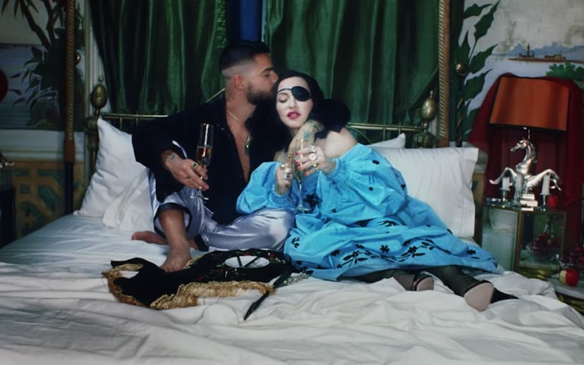 The video opens shrouded in darkness; it's not clear whether Madame X is in any real, physical danger or is simply worn down by the mistreatment of past lovers as she prays before running off to her over-the-top elopement with Maluma. "Dear God, how could I trust anyone after years of disappointment and betrayal?" she prays, asking, "How could I not want to run away again and again? From now on, I am Madame X. And Madame X loves to dance… Because you cannot hit a moving target." Who is trying to hit her? Is there going to be a dramatic chase played out a cross the album? Or is Madonna just being dramatic AF? Probably the latter, but I'm still intrigued.