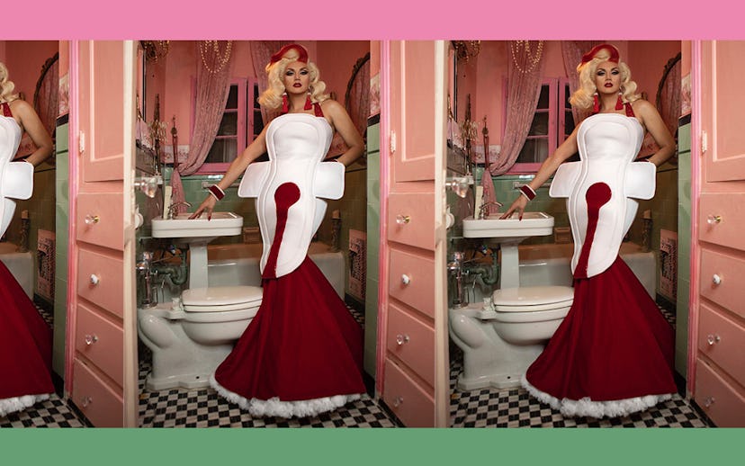 Instead, Luzon rocked her backup outfit, a "Cruella de Vil-meets-Reese Witherspoon" pink quilted number. It's not clear why, exactly, Ru and the producers nixed the original dress, but we can guess that it had a little something to do with exactly what Luzon was trying to work against. It's really too bad, in addition to being a stunning lewk (I wish my period blood was outlined in glitter) created with good intentions, Luzon, despite not being a menstruating human, would have been the most literally padded.