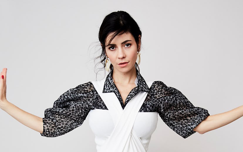 MARINA, the Welsh-Greek pop singer formerly known as Marina and the Diamonds (and born Marina Diamandis), has always been good at getting rid of things she doesn't want. "I don't own much," MARINA says, perched on a velvet couch at NYLON's offices in New York. Her jet-black hair is pulled back at the nape of her neck. She wears black leggings, a powder-blue sweater, and white sneakers. Her nails, the only trace of glam from the photo shoot she's wrapped just minutes before, are painted cherry-red.