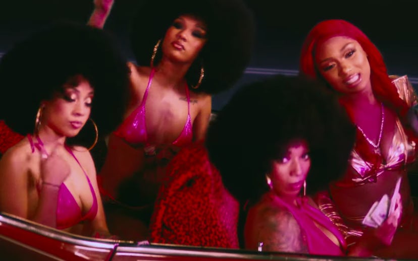 Like most of Megan's prior videos, she's enlisted the help of her friends, who don afro wigs with shiny bikinis. Flying money and colorful gun props get them right into character as a gang of vigilante baddies with Megan as their leader. The visual also serves as proof to Megan's claim in the song that she's "still hangin' with the same crew."