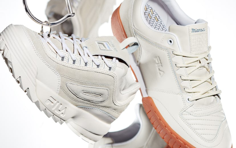 It was over a year ago when Fila approached Miansai for the now-official partnership, which is the first time the sportswear company has ever teamed up with a jewelry brand. Saiger and his team kicked off the creative process by finding inspiration from vintage styles and materials while going through Fila's archive of sneakers. Eventually, they landed on the Disruptor, a dad-like style that's blown up in popularity over the past year, and the men's Targa, which was originally designed for tennis. Both pairs retail for $110.