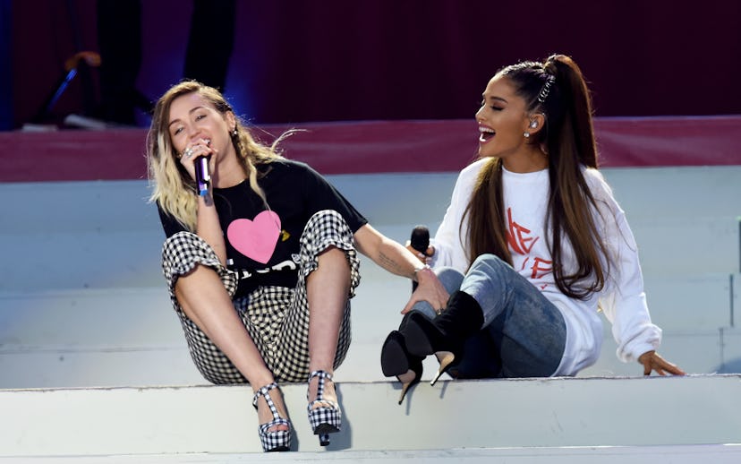 Last week, both Grande and Cyrus released new singles, Grande with "Imagine" and Cyrus with "War Is Over (Happy Xmas)." You might remember Grande's iconic tweet telling the internet to stop listening to "grown men arguing online" to support both of their singles. (Cough *Kanye West-Drake* cough.)