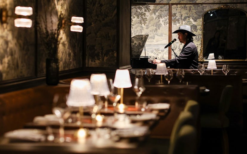 While this showy method of booze delivery attracted lots of attention at Feb. 29’s preview event (my friend and I couldn’t look away as a guy in a leather jacket engaged in some heavy petting with the statue’s frozen sunbursts), Chelsea Living Room is meant to be like visiting your vibiest friend’s garden apartment — if they passed prawn and bacon salad in endive leaves and hired a cowboy-hat-wearing jazz pianist who was, curiously, positioned to face a wall. As musician Louis B. Middleton launched into an understated rendition of “Clarity” by Zedd, I overheard one guest say, “He’s for sure a millennial,” in an approving way.