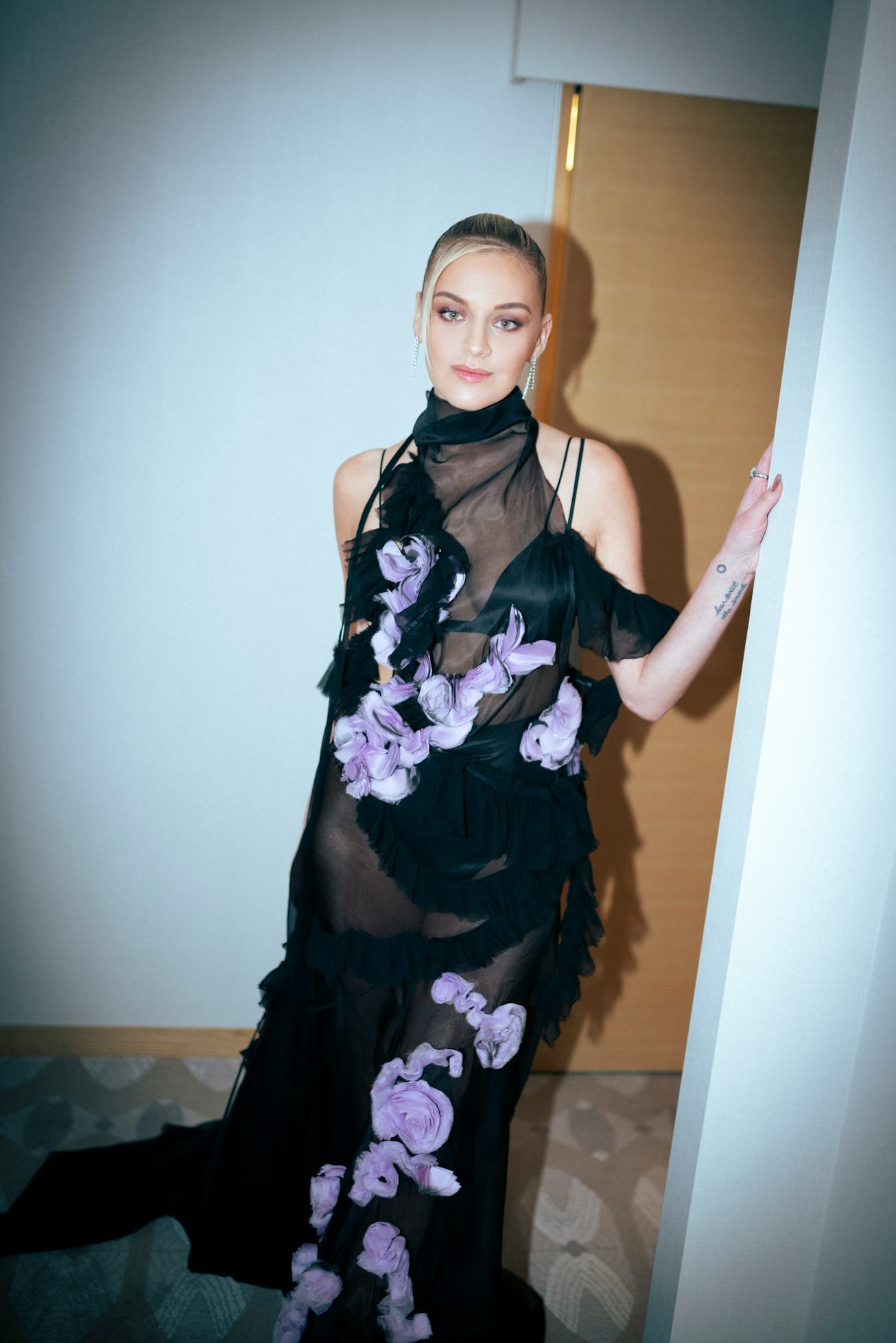 It’s the evening before the Grammys, where Ballerini is nominated for Best Country Album for her 2023 triumph Rolling Up the Welcome Mat. Ballerini is wrapping up a shoot in Calabasas when she calls, with very big evening plans: “I’m going back to the hotel and I'm going to swan dive into my bed.” She deserves the sleep. The next night, she’d arrive in the gown she describes as kind of a funeral for the Welcome Mat Era: a black silk organza high-neck halter mermaid gown appliquéd with silk chiffon ruffles and lavender hand-painted silk organza floral. It was a girls’ night for the singer (boyfriend Chase Stokes was back on set for the next season of Outer Banks): her date for the night was collaborator Alysa Vanderheym, and throughout the night, she could be seen cheering on fellow nominees, staying hydrated thanks to the FIJI water bottles placed strategically on every table, and dancing with fellow pop star Taylor Swift (the two were particularly unmissable in the crowd during Miley Cyrus’ performance, seemingly having the the best time of anyone else in the entire arena). She may not have taken home the award, but there are certainly plenty more ceremonies in her future — and damnit, she had fun.