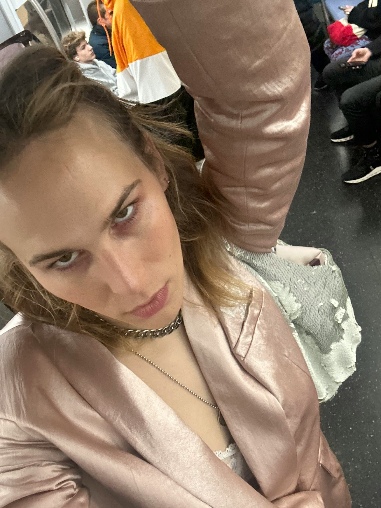 I wore a pink suit with white lace. I would say it was kind of giving lesbian-bride energy. Or like “corporate attorney in Florida advocating for trans youth.” I did my own hair and makeup. It was giving daytime, 3 p.m. I did some Saie concealer and face tint, Westman Atelier blush, Jones Road sparkly stuff all over my eyelids, and Glossier mascara, as always. For hair, I used a Dyson Airwrap and Gisou honey oil. And then on my lips, Makeup by Mario lip plumper in a blush-y pink. I felt really powerful, especially taking the train. I was like, “I’m commuting to work, aka Fashion Week.”