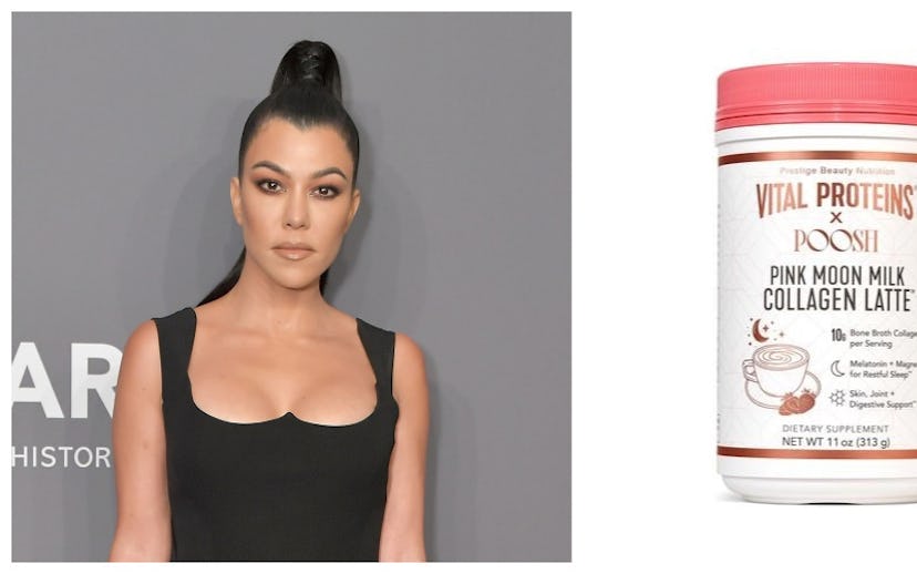 The Poosh x Vital Proteins collaboration includes two supplemental protein powders: One meant to be taken in the morning and one at night, before bed. There's the Blueberry & Lemon Collagen Vibes (yes, vibes) for the morning, which includes vitamin C, hyaluronic acid, and amla berry in addition to collagen. At night, Kardashian suggests you relax with her strawberry flavored Pink Moon Collagen Latte, with ingredients like ashwagandha, melatonin, and magnesium.