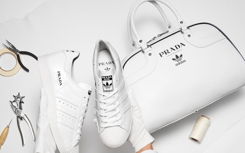 Prada and Adidas have released photos of their long-awaited collaboration on Monday, and the two brands have high hopes on bringing back the bowling bag. The limited-edition collection includes Prada's take on the classic Adidas Superstar sneaker, as well as a bowling bag inspired by the classic Prada silhouette and the Adidas gym bag. The black-and-white bag and sneaker are embossed with both Prada and Adidas logos.