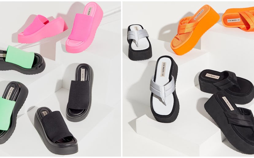 Because nostalgia doesn't seem to be going out of style any time soon, Steve Madden brought back its Slinky platform slides and thong sandals that we definitely had a pair (or two, or three) of back in the day. In addition to the black Slinkys that returned in 2017, there are now two new colorways added to the mix: neon pink and lime green. For the thong platforms, you can choose from black, silver, and neon orange.