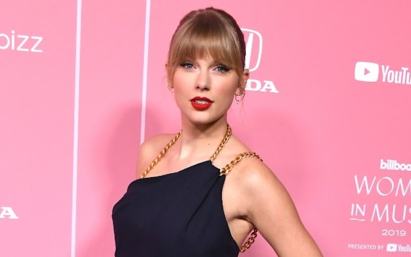 Taylor Swift got to celebrate her 30th birthday a day early at the 2019 Billboard Women In Music event in Los Angeles on Thursday night, wearing a gold chain-detailed black jumpsuit by Oscar De La Renta, a gold belt, and strappy gold heels by Sergio Rossi. She paired the look with a classic straight-bangs updo and a bright red lip, all in all giving off some pretty serious Lizzie McGuire (pre-reboot), early aughts vibes.