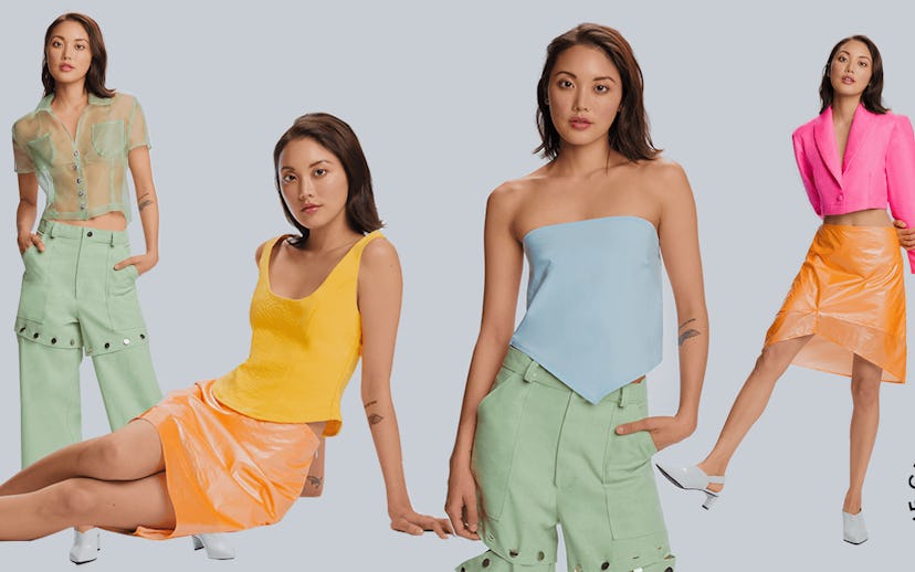 Inspired by the playfulness of the season, from the colors to overall energy, Lee went for extra bold with her latest collection, incorporating neons in the form of vinyl skirts and blazer-inspired crop tops into a classic pastel spring offering. However, a favorite would have to be her version of the convertible pant, a pistachio green trouser with detachable legs that become shorts. Sustainable and multifunctional? Don't mind if we do.