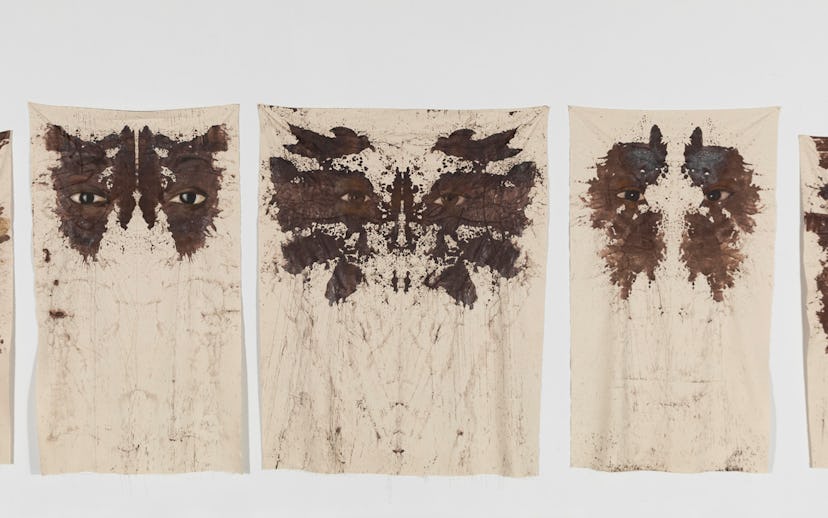 It's impossible to look at this art and forget that systemic racism is at the heart of our modern incarceration phenomenon. One series which stands out is Russell Craig's E-Val. Craig's large-scale tapestry-like works use ox blood, as a substitute for human blood, with which he created abstract, Rorschach-like figures with eyes painted on them. The pieces are meant to serve as "fragmented portraits of Black Americans involved in police-involved shootings." Other pieces photograph Black men who have been involved in the prison system, showcasing them in a manner that honors them as people, not as numbers.