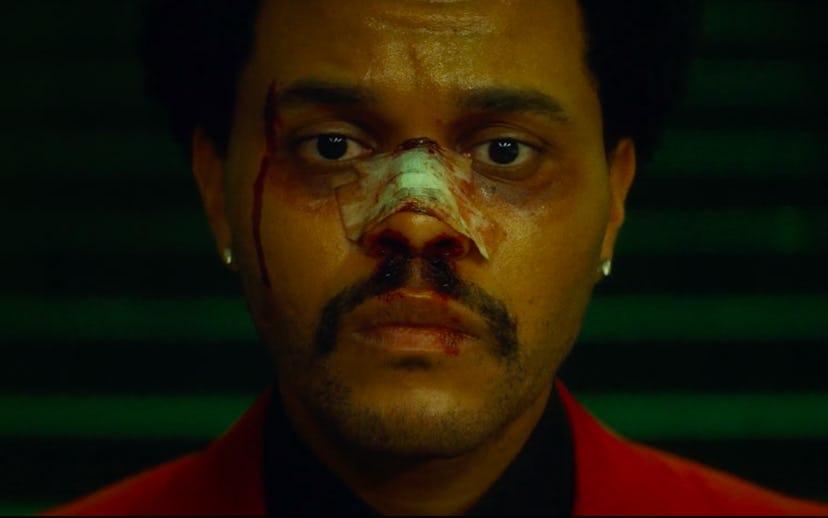 In the new video, which only features faint snippets of songs in the background, The Weeknd is again sporting the same Joker-inspired red suit — but this time, we start with the singer onstage alongside Jimmy Kimmel as the popular late night host instructs his audience members to "give it up for The Weeknd, everybody!" He then walks off stage, sporting a giant smile that slowly unfurls into a worried frown as he paces out into the street and then below ground into a subway station. As in "Blinding Lights," his face is completely beat-up, with bloody cuts on the side of his eye and mouth and a piece of bandaged gauze covering his nose.